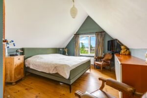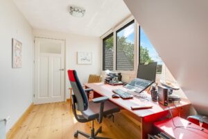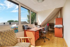 Op de eerste verdieping vind je vier slaapkamers. De master bedroom heeft een dakkapel en een inloopkast. Alle slaapkamers zijn licht en ruim door de dakkapellen, waarbij de schuine plafonds toch een knus gevoel geven. De luxe badkamer met inloopdouche en Whirlpoolbad zorgt voor een spa-ervaring in je eigen huis. En dat uitzicht vanuit het bad! Je hebt op de eerste verdieping ook een apart toilet: ideaal met een gezin.