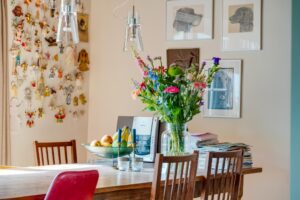 Je komt binnen in de ruime zitkamer. De massief houten vloer geeft de woonkamer een landelijke uitstraling en de houtkachel zorgt voor extra warmte en gezelligheid tijdens de koudere dagen. In de zomer loop je via de openslaande tuindeuren zo je tuin in.