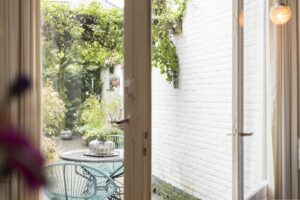 Aan de achterkant kun je de openslaande deuren openzetten naar de sfeervolle tuin. Tijdens warme zomeravonden kun je hier tot in de late uurtjes heerlijk buiten zitten.
