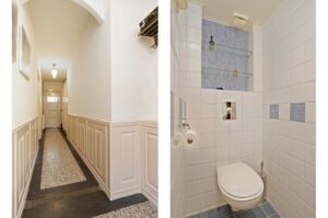 Je komt binnen via de imposante lange hal, waar de originele vloer en de lambrisering je meteen terug in de tijd brengen. De woonkamer is heerlijk licht en door de erker maak je hier moeiteloos een sfeervolle ruimte van. De fijnste plek van het huis om ‘s ochtends een kop koffie te drinken is voor de grote ramen in de erker. Daar heb je de ochtendzon op je gezicht, terwijl je door het groen in de voortuin een glimp opvangt van het karakteristieke pand aan de overkant van de straat.