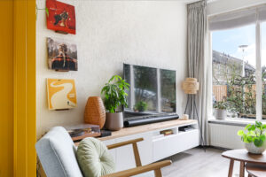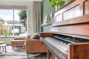 Via de hal (met toilet en trap naar boven) kom je in de woonkamer. De afwerking hier is verzorgd en neutraal en het is heerlijk licht dankzij de grote ramen aan zowel de voor- als achterzijde. De kamer is praktisch ingedeeld met een zitgedeelte aan de voorkant en een ruime eethoek aan de tuinkant.