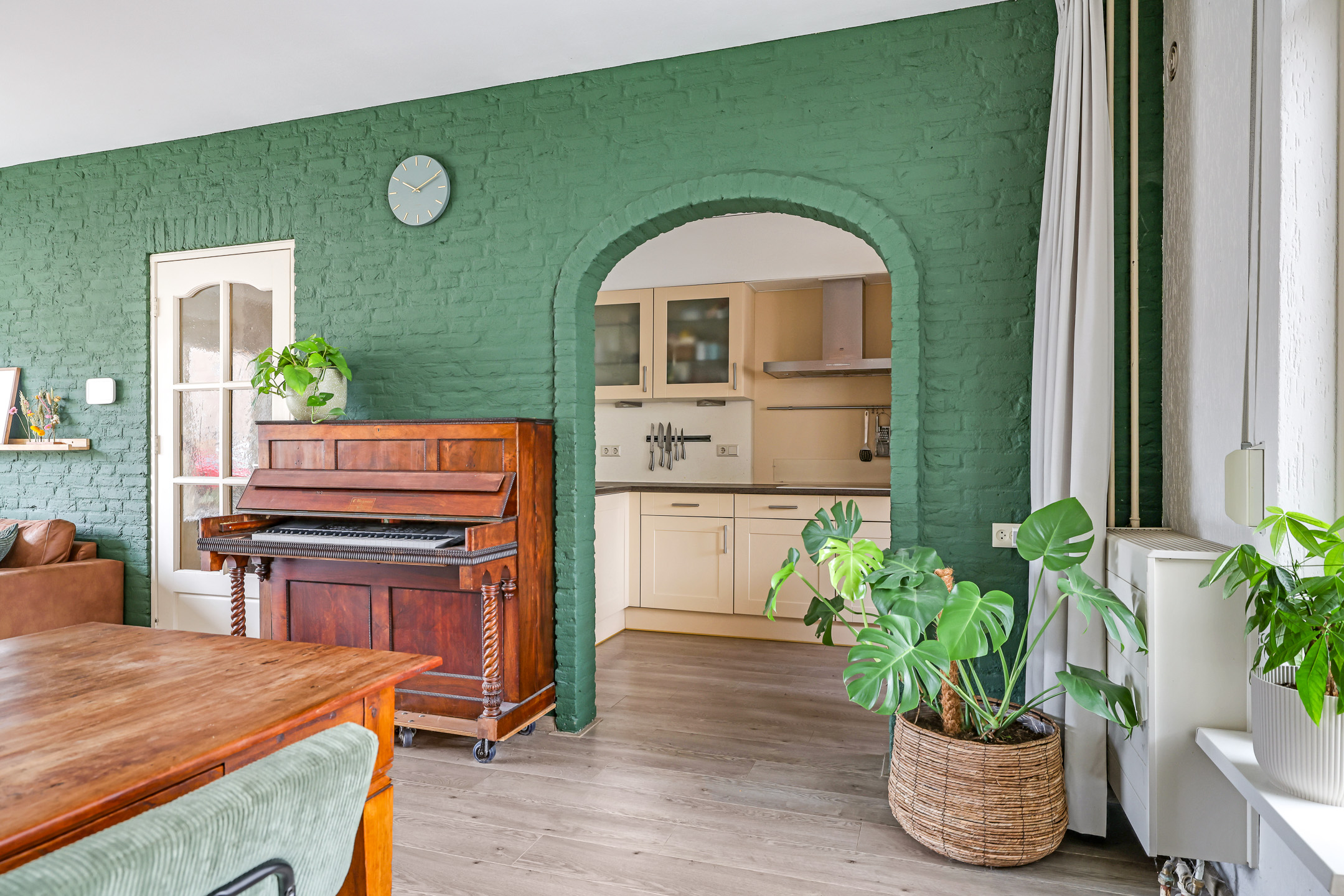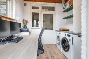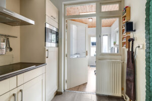 De keuken is praktisch ingericht in een hoekopstelling en voorzien van inbouwapparatuur. Aansluitend is er een bijkeuken, ideaal voor de was, extra bergruimte of een extra koelkast of vriezer.