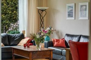 De achtertuin is lekker rustig en groen. Ruim en weelderig opgezet, netjes onderhouden en met veel verschillende plekken voor een zitje. Aan de rechterkant heb je geen directe buren, maar kijk je uit over een uitgestrekt weiland. Dit geeft je het gevoel dat je even helemaal weg bent van de drukte.