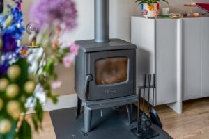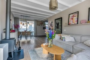 De woonkamer is een heerlijke plek om thuis te komen. De grote ramen zorgen voor een zee aan natuurlijk licht en de houten vloer geeft een warme uitstraling. De houtkachel is niet alleen een sfeermaker, maar ook een heerlijke bron van warmte voor de koukleumen onder ons.