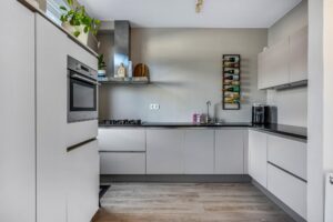 Interieurliefhebbers opgelet! Deze keuken is echt een plaatje. Modern en functioneel, met een open indeling die naadloos aansluit op de eetkamer. Strakke kasten en een ruim werkblad bieden veel opbergruimte en werkoppervlak. Grote ramen zorgen voor veel natuurlijk licht en een fijn uitzicht op de gezellig ingerichte tuin.
