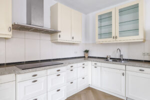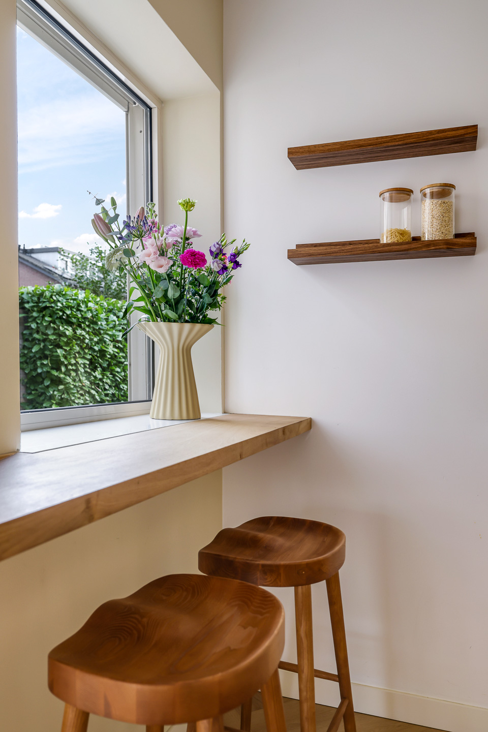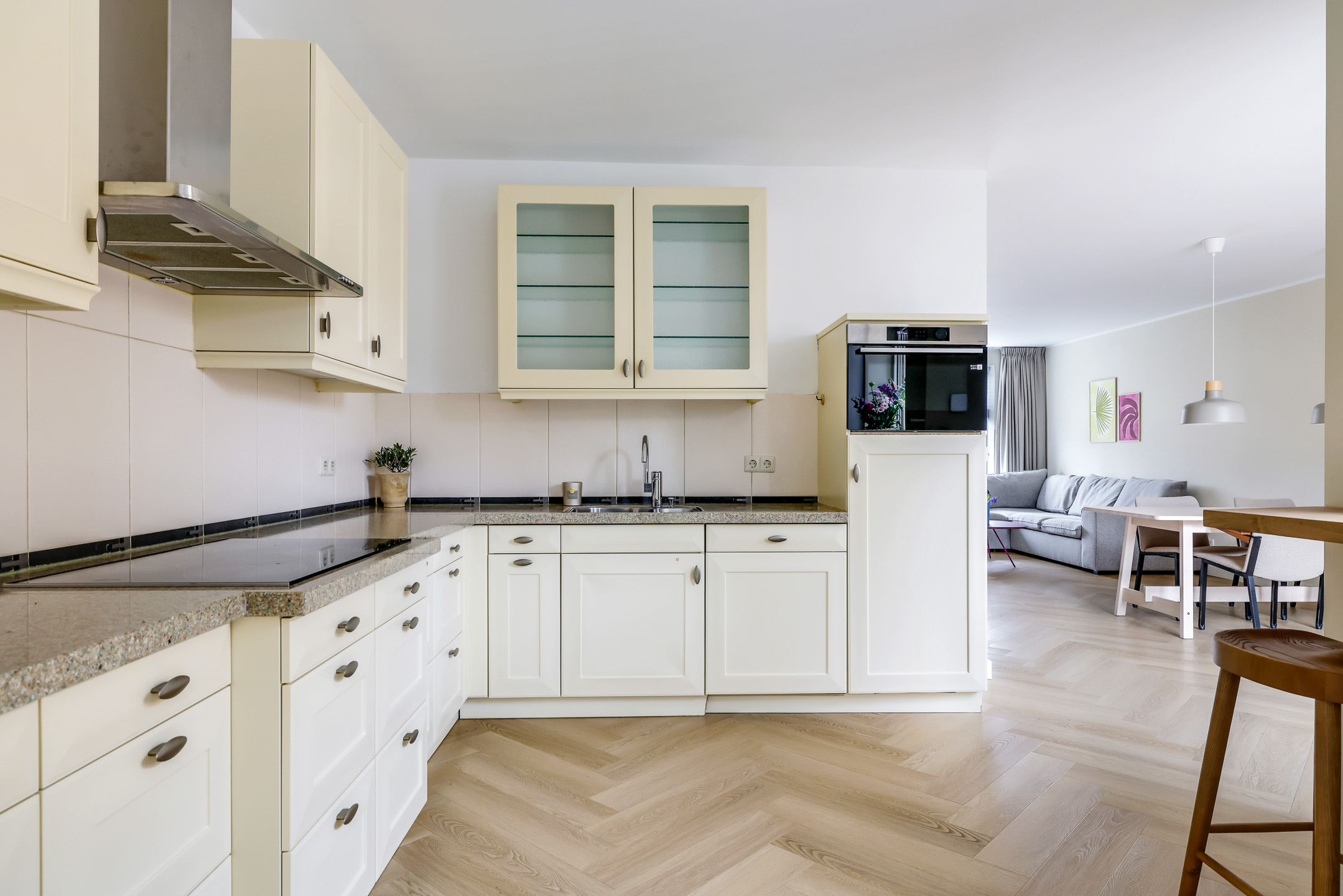 De keuken sluit mooi aan op de leefruimte en is praktisch opgesteld met voldoende werk en kastruimte. De keuken heeft een werkblad van natuursteen en recentelijk vernieuwde vaatwasser, koelkast en combimagnetron. Een snelle kop koffie kan perfect aan het barretje, met uitzicht op de tuin. Aan de keuken grenst nog de bijkeuken, met genoeg ruimte voor de wasmachine, droger en alle jassen, schoenen en tassen.