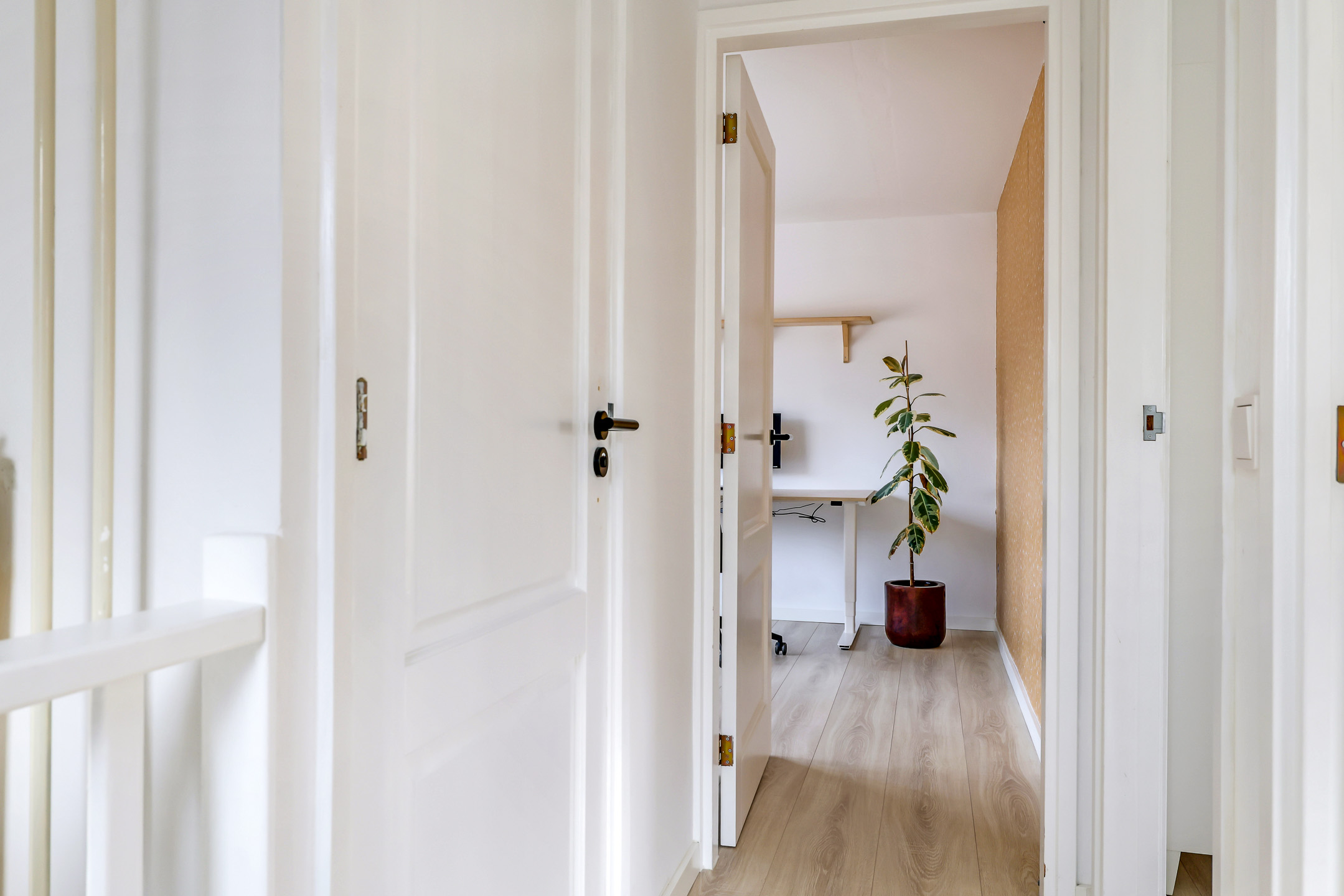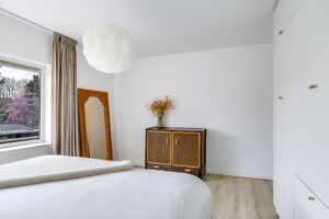 Ook boven is de sfeer rustig en verzorgd. Er zijn drie slaapkamers, waaronder een fijne slaapkamer met veel ruimte voor verschillende kasten. Dat geeft niet alleen veel opbergruimte, maar ook rust in de kamer. Er is nog een ruime slaapkamer met uitzicht op het Julianaplein. De kleinste kamer is ideaal als babykamer of werkkamer. De badkamer is compact maar slim ingedeeld, met een inloopdouche, toilet en wastafelmeubel.