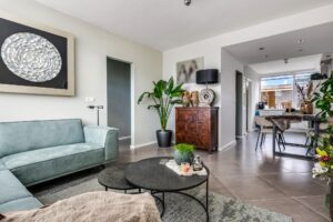Wat een fijne ruimte! Zodra je binnenkomt heb je meteen een gevoel van ruimte in de lange, moderne hal. Ook de open verbinding met de woonkamer is open, wat bijdraagt aan dit gevoel. Grote ramen zorgen voor lekker veel licht. Strak stucwerk, neutrale muren en de grote, grijze tegels gevel een neutrale en toch sfeervolle basis.