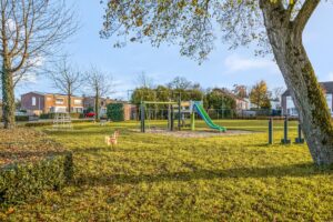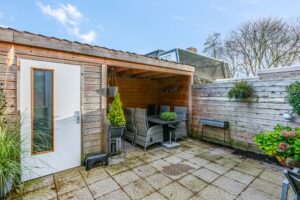 De achtertuin is lekker onderhoudsvriendelijk en op het oosten, perfect om van de ochtendzon te genieten. Onder de overkapping is genoeg ruimte voor een gezellige zithoek. En met een speeltuin voor de deur, kunnen de kleintjes zich helemaal uitleven. De vrijstaande houten schuur biedt extra bergruimte voor al je spullen.